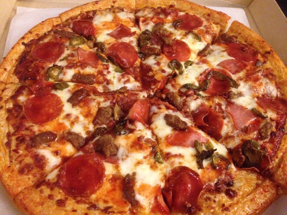 This loaded pizza is the perfect choice for family dinner or a lunch with your crew. Includes pepperoni, seasoned pork, beef, mushrooms, green bell peppers and onions.